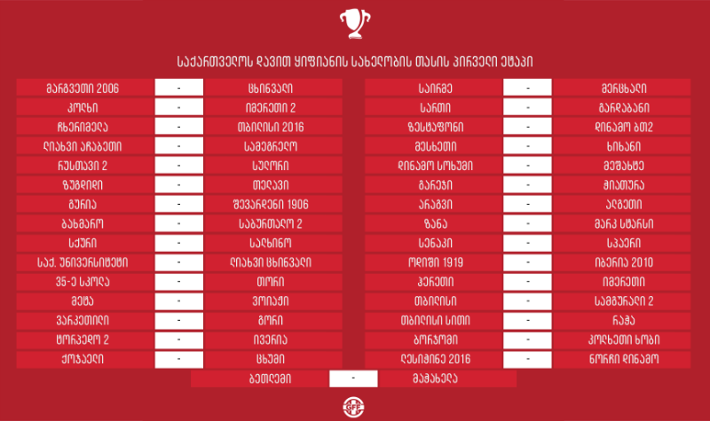 კენჭისყრის შედეგად გაირკვა, რომ თასის გათამაშების პირველ საკვალიფიკაციო ეტაპზე ზესტაფონელები დავით აბაშიძის სახელობის სტადიონზე რეგიონული ლიგის წარმომადგენელ ბათუმის "დინამო"-2-ს უმასპინძლებენ, ხოლო ამ ეტაპის წარმატებით გავლის შემთხვევაში რეგიონლიგელი "სართისა" და მესამე ლიგის ბინადარი "გარდაბნის" წყვილში გამარჯვებულს დაუპირისპირდებიან...